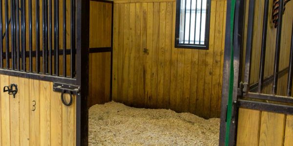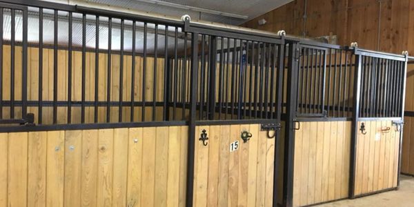 A 12x12 stall equipped with a automatic water bowl, grain tray and a corner hay feeder. There are also stalls that have a window. Some stalls have full wall partitions and others are half wall partitions.
